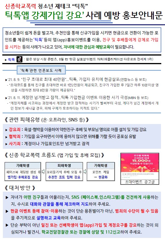 신종학교폭력 (틱톡앱 강제가입강요) 예방 홍보 안내문