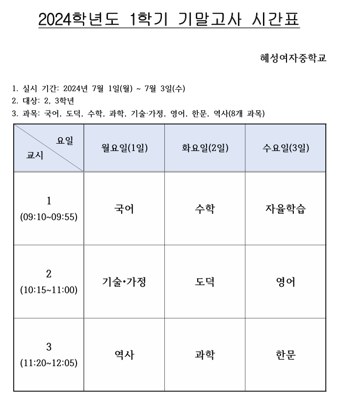 2024학년도 1학기 기말고사 시간표